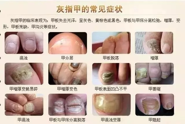 3.主要表現(xiàn)為指(趾)甲板增厚、光澤消失、變色、變形或甲板破壞。